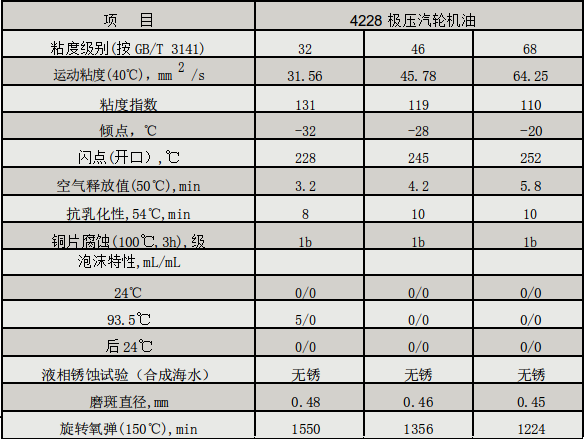 4228極壓汽輪機(jī)油采用特定組成的半合成基礎(chǔ)油,加入抗氧、防銹、抗泡、抗乳化等精選優(yōu)質(zhì)添加劑精制而成。